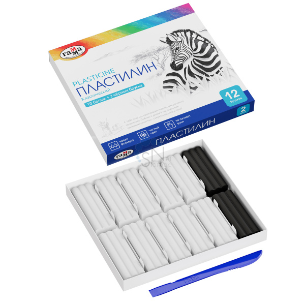 Пластилин 2 цвета 240гр 12 шт 10 бел+ 2 черн Гамма Классический со стеком картонная коробка 27032025_102